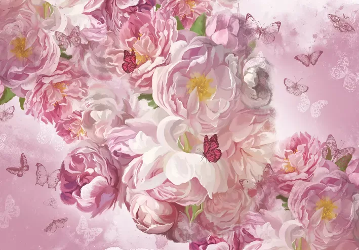 Fototapete: Peonijas Un Lidojoši Taureņi